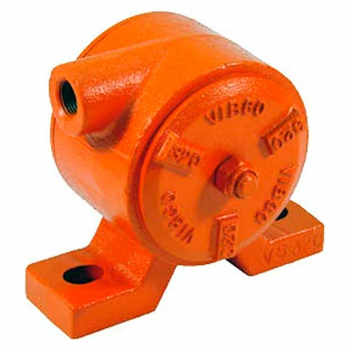 VS series Silent Pneumatic Turbine Vibrator. High Speed, quick starting version. Built in exhaust muffler. Cast iron housing standard (Aluminum available). 6800 VPM, 11 CFM, @ 60 PSI, with 600 lbs of force, continuous duty. Intermittent duty to 80 PSI maximum. No lubrication required Factory recommended filter regulator for optimum performance.